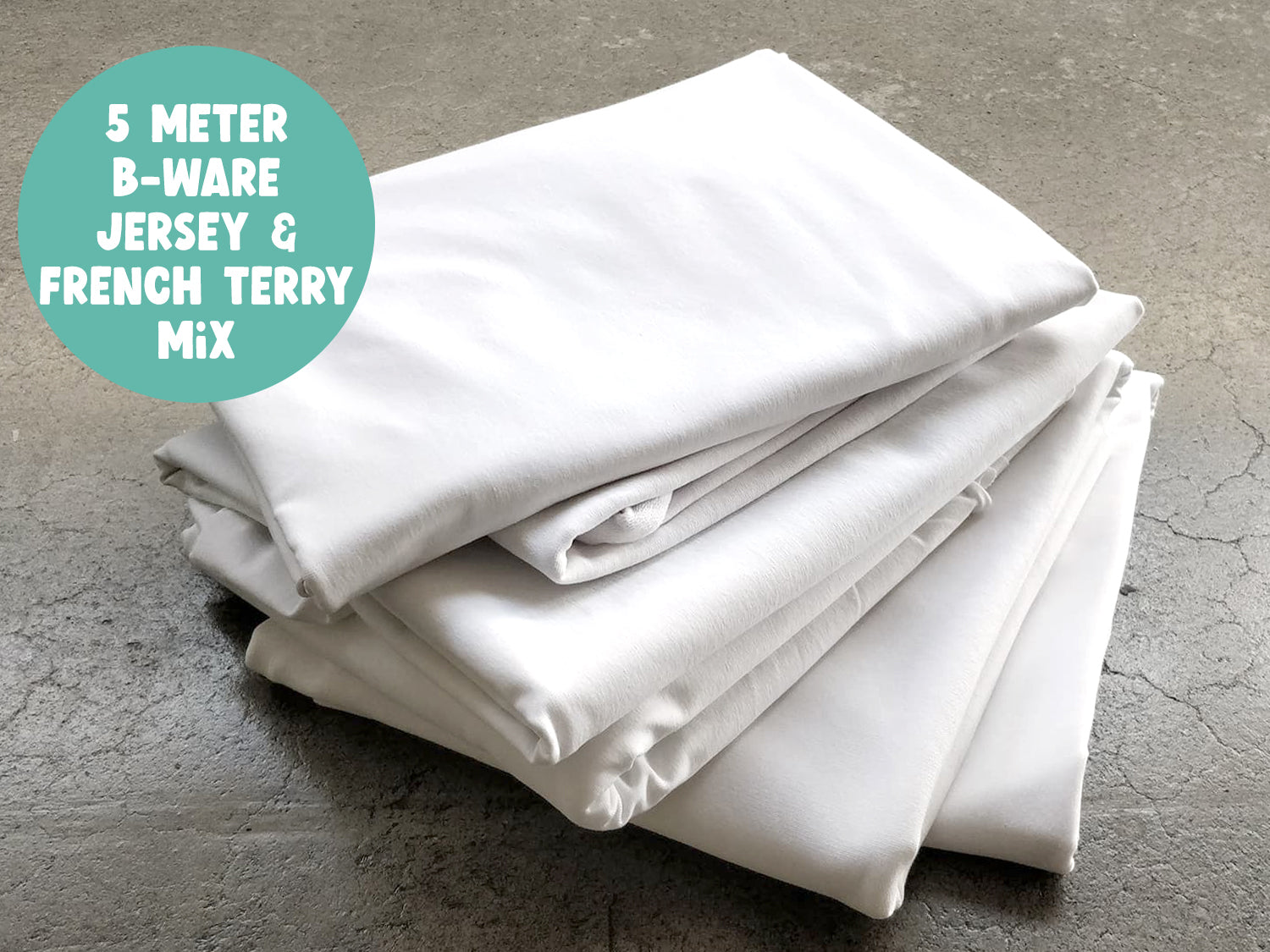 Colis B-stock avec un total de 5 mètres (pièces de différentes tailles) de jersey uni et French Terry uni dans différentes nuances de blanc. Les B-goods signifient en réalité des B-goods avec des taches, des écritures Edding, des trous, des erreurs de tricot, des coutures,...